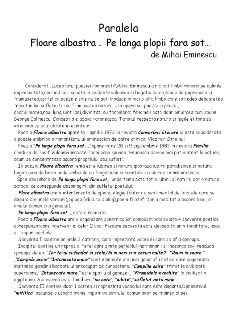 Comentariu Paralela Pe Lana Plopii Fara Sot Floarea Albastra